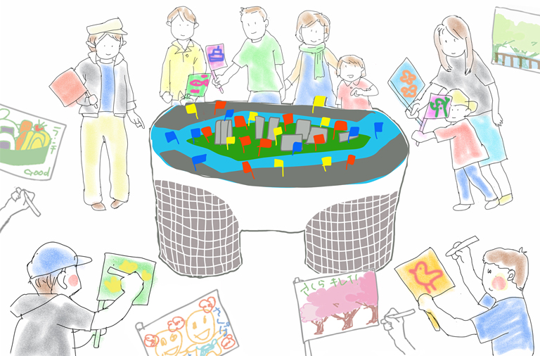 ウォーキングで発見したこと、お気に入りのスポット等を旗に描き、みんなで中之島エリアのマップを作ります。
